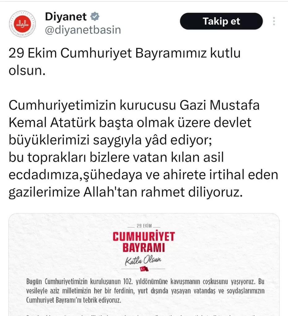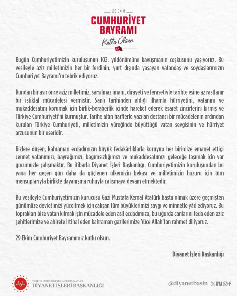 Cumhuriyetimizin kuruluşunun 102. yıldönümüne kavuşmanın coşkusunu yaşryoruz. Buvesileyle aziz milletimizin her bir ferdinin, yurt disında yaşayan vatandaş ve soydaşlarımizınCumhuriyet Bayramı’nı tebrik ediyoruz.Bundan bir asır önce aziz milletimiz, sarsılmaz imanı, dirayeti ve ferasetiyle tarihte esine az rastlanırbir stiklal üicadelesi vermiştir. Şganl tarihinden aldıği ilhamla hürriyetini, vatanını vemukaddesatını korumak için birlik-beraberlik içinde hareket ederek esaret zincirlerin krmis veTürkiye Cumhuriyeti ni kurmuştur. Tarihe altın harflerle-yazılan destansı bir mücadelenin ardındankurulan Türkiye Cumhuriyeti, m illetimizin yüreğinde büyüttüğü vatan sevgisinin ve hürriyetarzusunun bir eseridir.Bizlere düşen, kahraman ecdadmızın büyük fedakârlıklarla koruyup her birimize emanet ettiğicennet vatanımizi, bayrağımızı, bağımsızlığımızı ve mukaddesatımızı geleceğe taşımak için vargücümüzle çalışmaktır. Bu itibarla Diyanet īşleri Başkanlığı, Cumhuriyetimizin kuruluşundan buyana her geçen gün daha da güçlenen ülkemizin bekas ve milletimizin uzuru için tùmmensuplarryla birlikte dayanışma ruhuyla çalışmaya devam etmektedir.Bu vesileyle Cumhuriyetimizin kurucusu Gazi Mustafa Kemal Atatürk basta olmak izere geçmistengünümüze devletimizi yüiceltmek için çalışan tüm büyüklerimizi saygı ve minnetle yâd ediyoruz. Butoprakları bize vatan klmak için mücadele eden asil ecdadımiza, bu uğurda canlarını feda eden azizsehitlerimize ve ahirete irtihal eden kahraman gazilerimize Ytice Allah’tan rahmet diliyoruz.29 Ekim Cumhuriyet Bayramımız kutlu olsun.TÖRKİYE CUMHURİYErİ CUMHURBAŞKANLIĞI”): DİYANET İŞLERİ BAŞKANLIĞIDiyanet İşleri Başkanlığı@diyanetbasin
