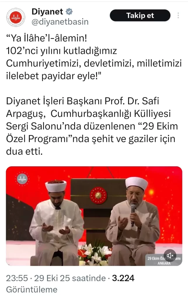 Yeni Diyanet İşleri Başkanı olan Sn. Prof.Dr.Safi ARPAGUŞ beyefendiyi 724turkiye.com ailesi olarak gönülden tebrik ediyoruz. Kutlama mesajı; Cumhuriyetimizin kuruluşunun 102. yıldönümüne kavuşmanın coşkusunu yaşryoruz. Buvesileyle aziz milletimizin her bir ferdinin, yurt disında yaşayan vatandaş ve soydaşlarımizınCumhuriyet Bayramı’nı tebrik ediyoruz.Bundan bir asır önce aziz milletimiz, sarsılmaz imanı, dirayeti ve ferasetiyle tarihte esine az rastlanırbir stiklal üicadelesi…