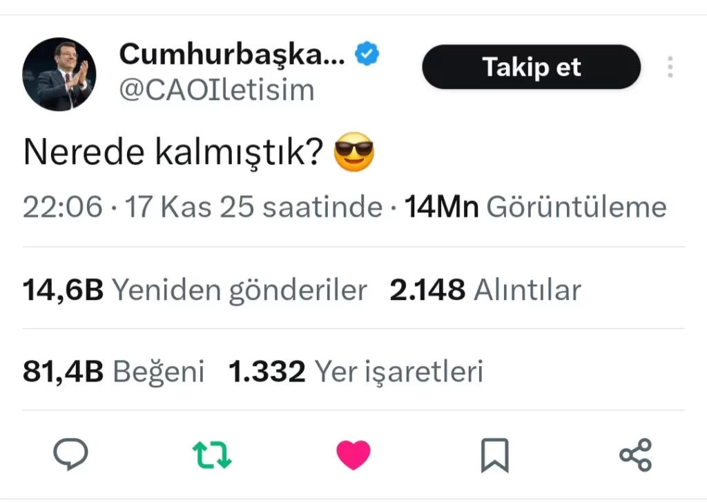 Ekrem İMAMOĞLU ” Nerede kalmıştık?😎” şeklinde attığı X platformundaki twiti dünya rekoru kırdı! 24 saatte 14.000.000 tıklanma yaptı. Dünyada ve Türkiye’de rekor kırılamayacak bir rekora imza attı.