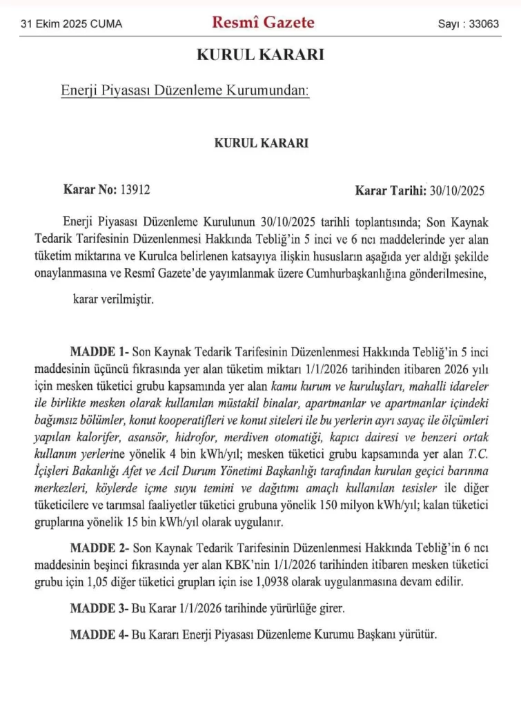 Enerji Piyasası Düzenleme Kurul kararı Resmi Gazetede yayınlandı.