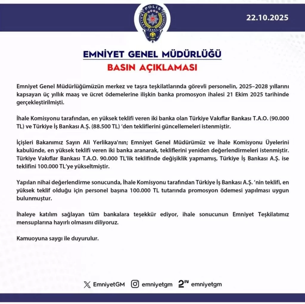 Emniyet Genel Müdürlüğümüzün merkez ve taşra teşkilatlarinda görevli personelin, 2025-2028 yillarinıkapsayan üç yıllık maaş ve ücret ödemelerine ilişkin banka promosyon ihalesi 21 Ekim 2025 tarihindegerçekleştirilmişti: ihale Komisyonu tarafından, en yüksek teklifi veren iki banka olan Türkiye Vakıflar Bankası T.A.O. (90.000TL) ve Türkiye İş Bankası A.$. (88.500 TL) ‘den tekliflerini güncellemeleri istenmiştir. Içişleri Bakanımız Sayın Ali…