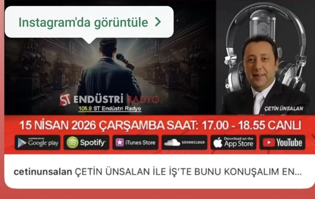 ST Endüstri Radyo’nun ilgiyle takip edilen programı “İş’te Bunu Konuşalım”, 15 Nisan 2026 Çarşamba günü iş dünyasının önemli isimlerini ağırlamaya devam ediyor. Saat 17.00 – 18.55 arasında canlı olarak yayınlanacak programın sunuculuğunu Çetin Ünsalan üstleniyor.