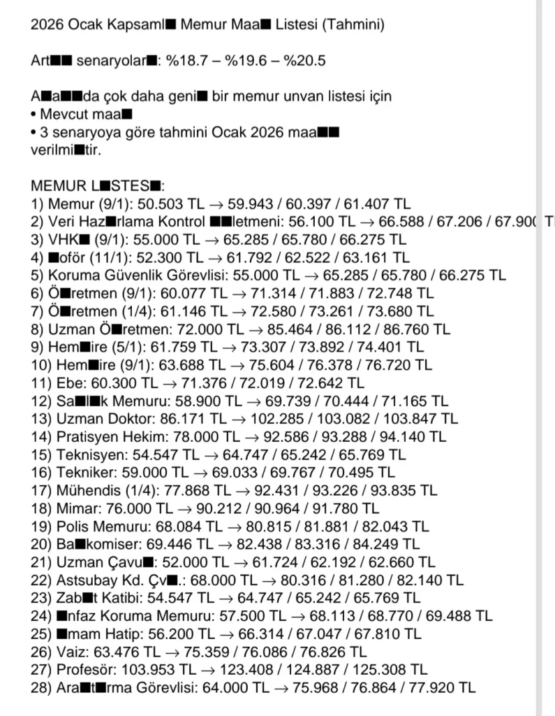 Memur maaşları, yılda iki kez yapılan artışlara dayanıyor: Ocak ve Temmuz dönemlerinde. 2026 Ocak ayı artışı için iki ana bileşen bulunuyor. Toplu sözleşme zammı (bir önceki sözleşmeye göre belirlenen yüzde)b. Enflasyon farkı: Yılın ilk yarısı ya dabelli dönem için gerçekleşmiş fiyatartışlarına göre. • Örneğin Türkiye Cumhuriyet MerkezBankası’nın 2025 sonu için enflasyontahmin aralığı %31-33 olarak belirtilmiş…