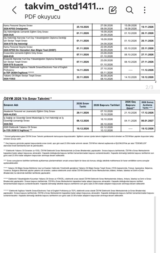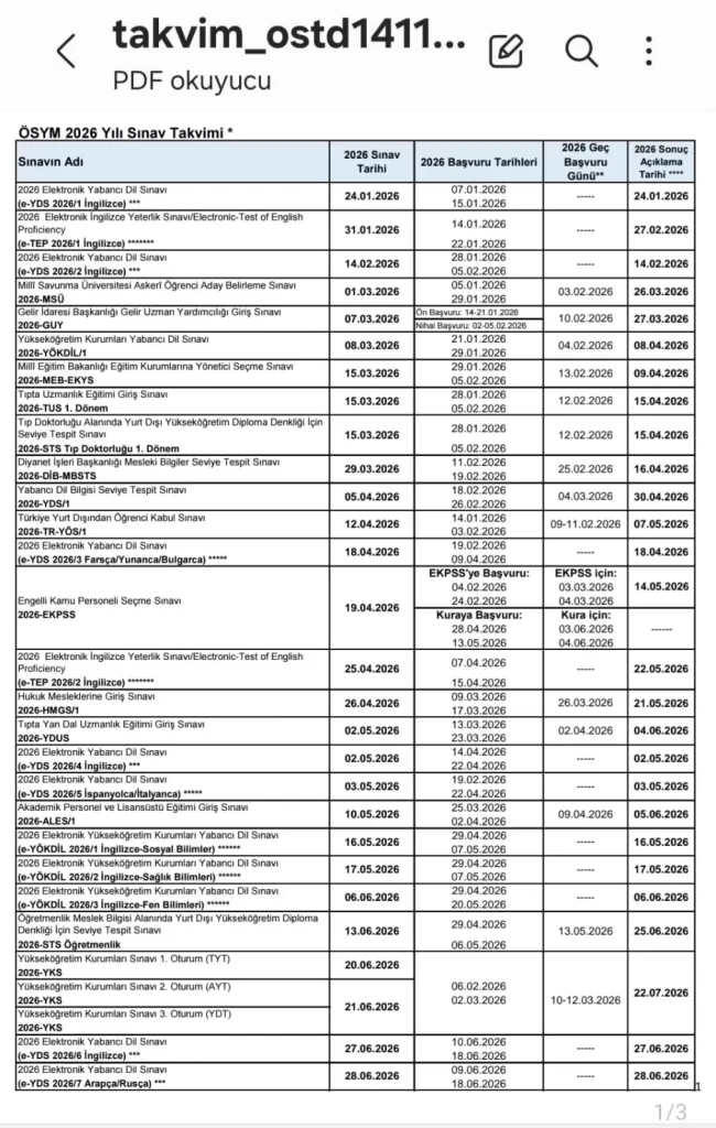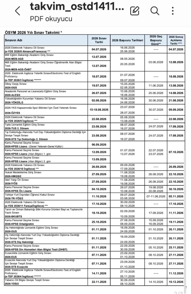 YDS ve YÖKDİL tarihleri ise; YDS/1: 5 Nisan 2026, YDS/2: 22 Kasım 2026, YÖKDİL/1: 8 Mart 2026, YÖKDİL/2: 2 Ağustos 2026 tarihlerinde olacak.