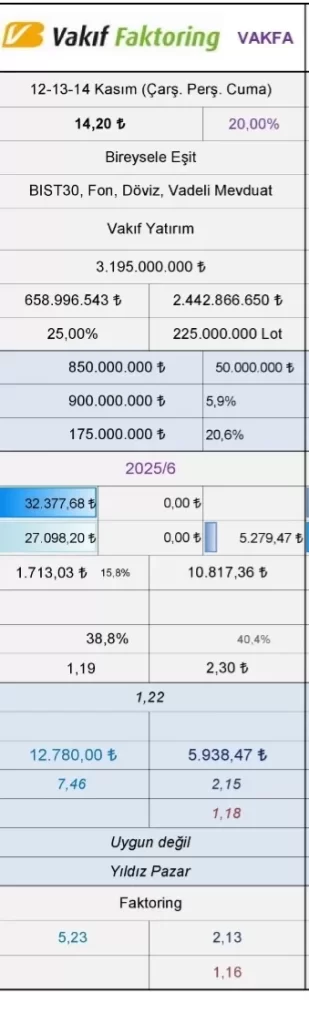 Vakıf Faktoring 14,20 TL Fiyatla Halka Arz Ediliyor: Talep Toplama Tarihleri Belli Oldu. 12-14 Kasım 2025 tarihleri arasında EŞİT dağıtım yoluyla halka arz edilecek. %60 Yurtiçi Bireysel Yatırımcıya, %40 ise Yurtiçi Kurumsala dağıtılacak. Toplam 225 milyon hisse dağıtımı yapılacak ve Yıldız Pazarda işlem görecek.